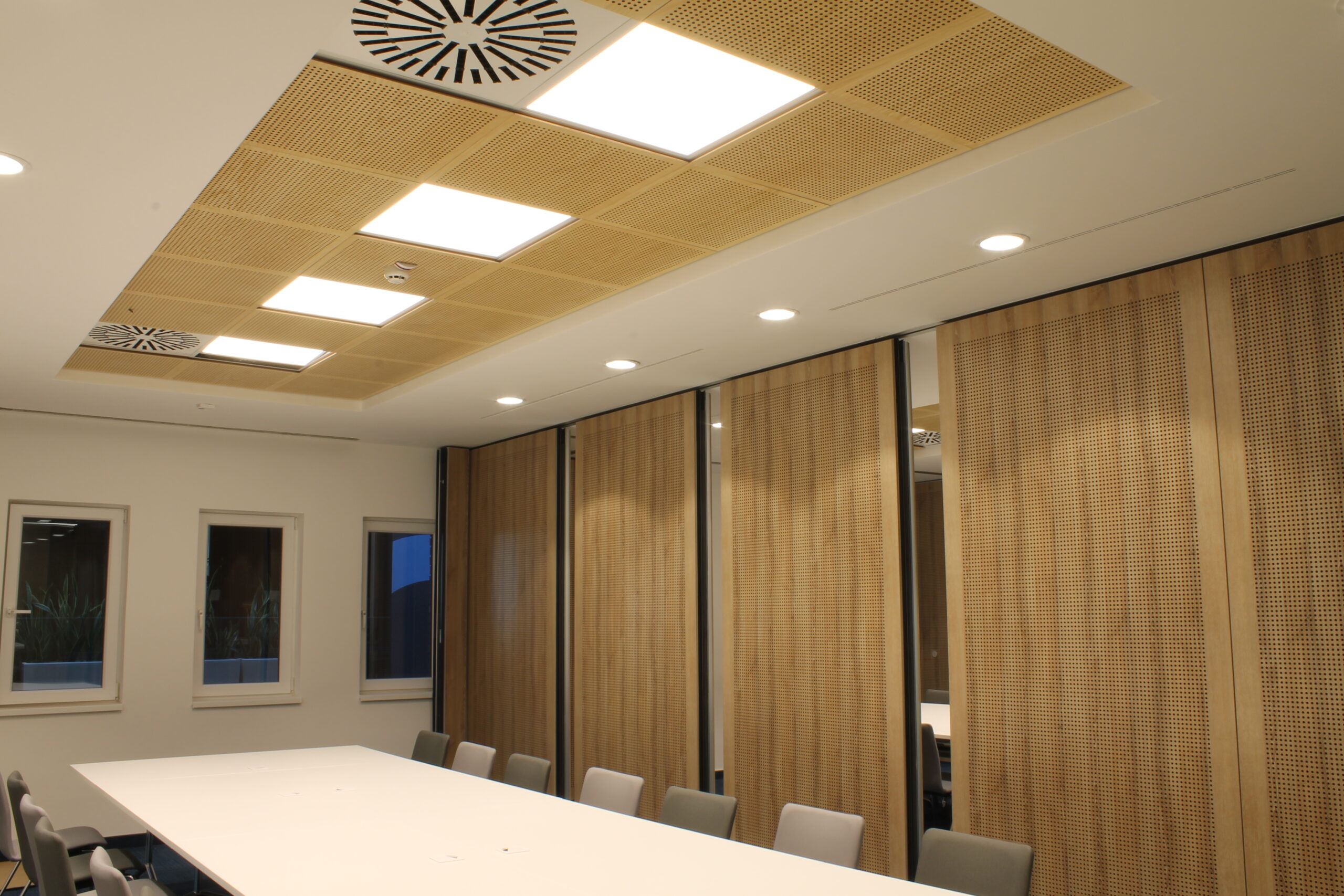 Alors que nos panneaux de plafond suspendu acoustiques ESK103 ont été utilisés sur les plafonds des salles de réunion, des panneaux de cloison amovible acoustiques ont été préférés pour les murs séparant les salles de réunion. Grâce aux cloisons amovibles, deux salles de réunion séparées peuvent être utilisées indépendamment, mais elles peuvent également être combinées en un seul grand espace pour des réunions plus nombreuses. Afin de maintenir l’aspect moderne de l’espace, l’installation des panneaux en bois acoustiques sur les plafonds a été réalisée avec des supports cachés.